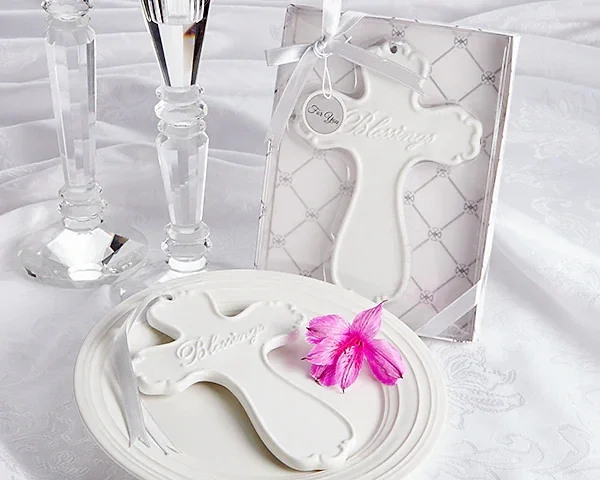 - Pure white porcelain cross with artful, smooth detail edges and "Blessings" embossed script